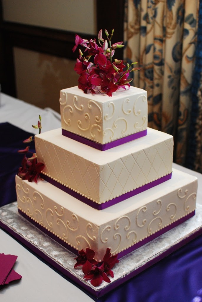 purple cake orchids square silver layer roses ivory piping weddings cascading fuchsia
